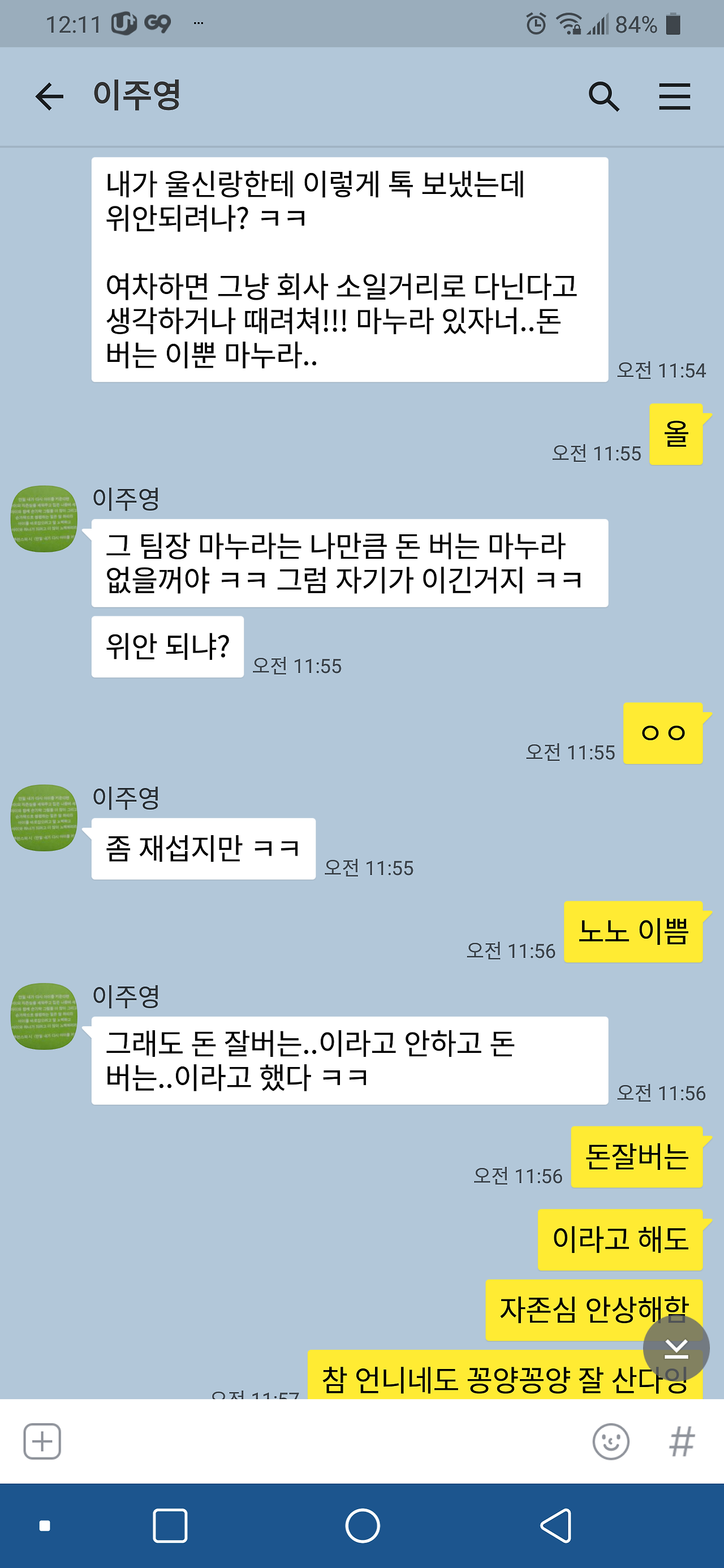 언니가 또 순하기는 되게 순해서 어떻게든 남편 기 살려주려고 언니가 형부보다 2배로 많이 벌지만 그말을 못하고 있다고 했다. 왜냐? 남편 괜히 상처받을까봐...