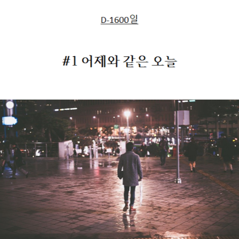 'D-1600일' 마치 직딩일기와도 같은 이 글은 계획한 그날이 올 무렵까지 틈틈이 계속될 거다. 그날을 앞둔 이들과 소통할 수 있길 바란다.