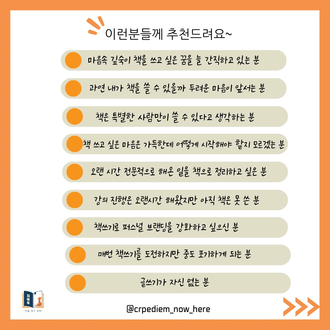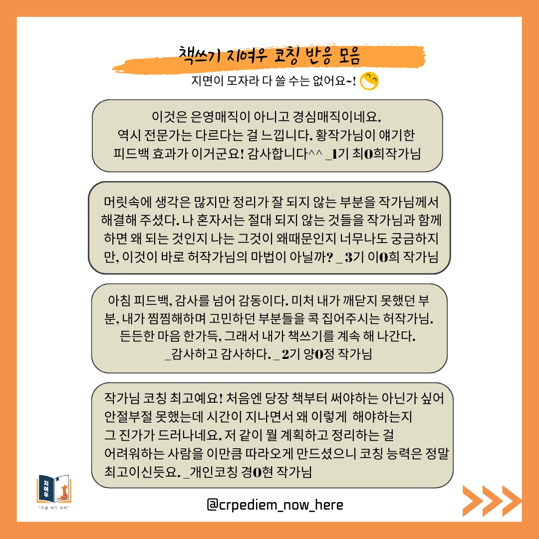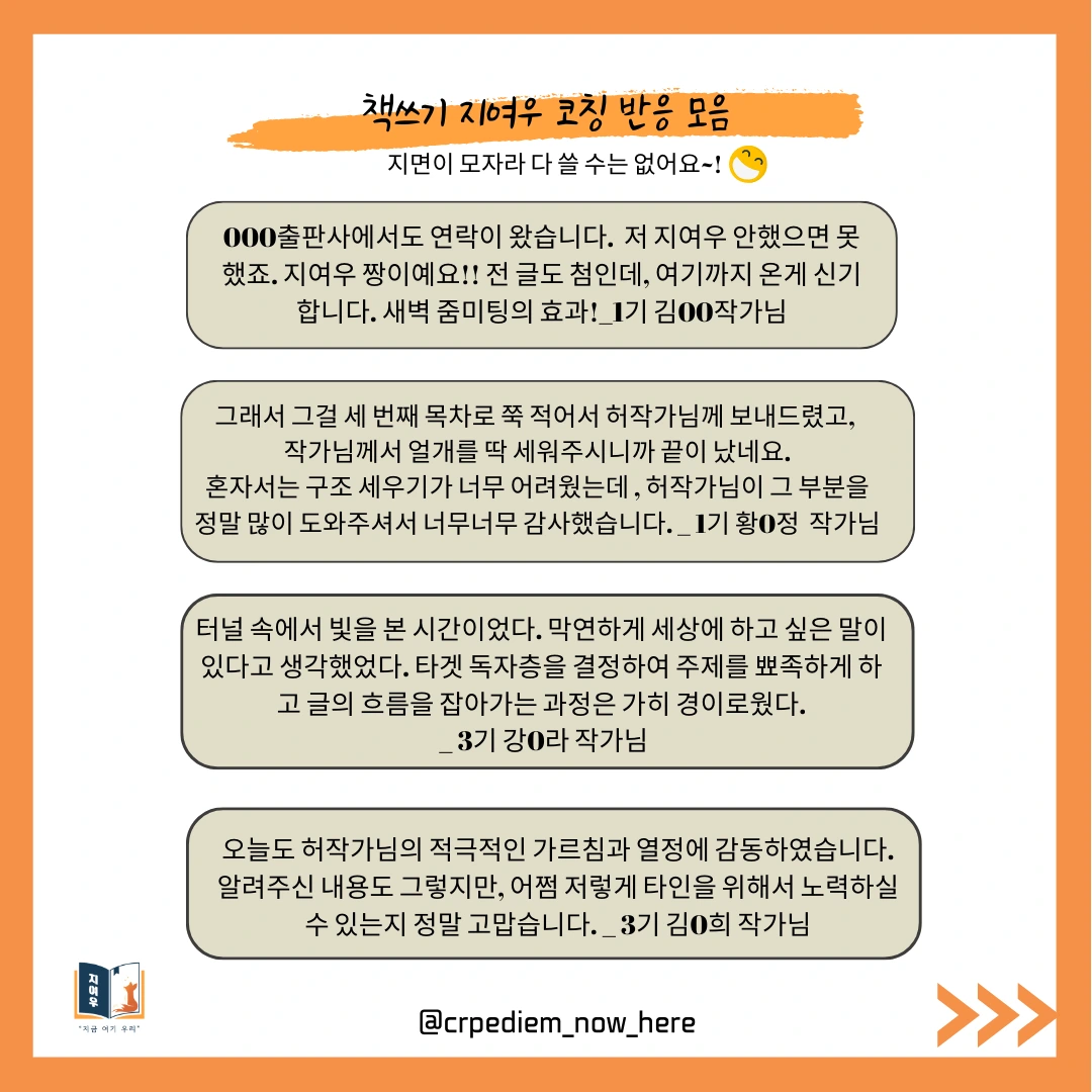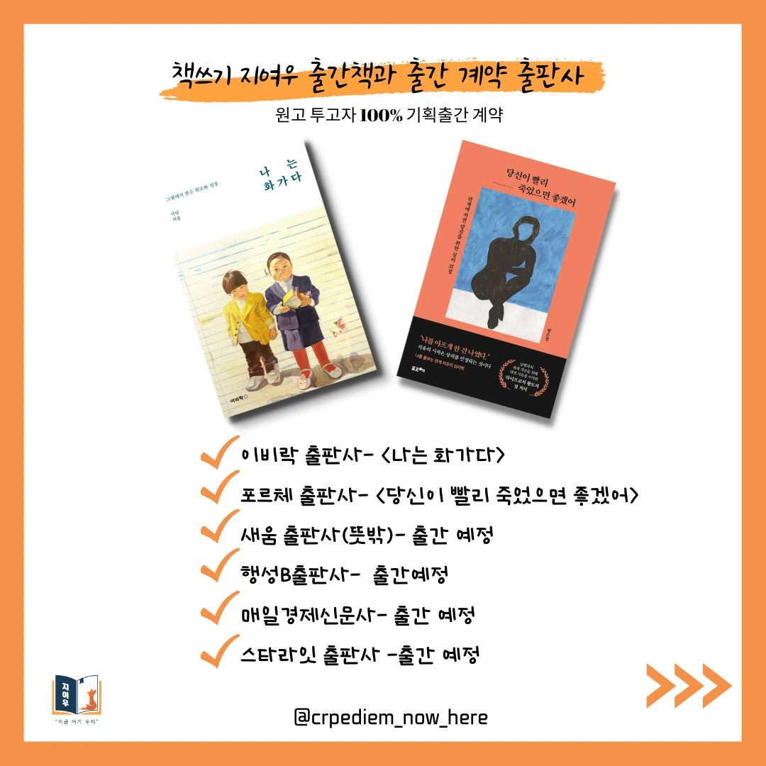 저는 2년 전, <어느 날, 나에게 공황장애가 찾아왔습니다> 에세이 단행본을 출판했는데요, 당시 책을 쓰며 마음을 다잡기가 너무 힘겨워 블로그에 글을 쓰기 시작했습니다. 이름하야 '책쓰기 도전기'였는데 이왕 쓰는 거 내 감정풀이로만 이어가지 말고 나처럼 책을 쓰며 힘든 분들께 도움이 되고자 했죠. '책쓰기 도전기'는 감사하게도 날개를 달아 책쓰기 코칭까지 요청이 들어왔습니다. 그 일을 계기로 '허경심 작가와 함께 책쓰기 프로젝트 지여우'를 시작하게 되었어요.