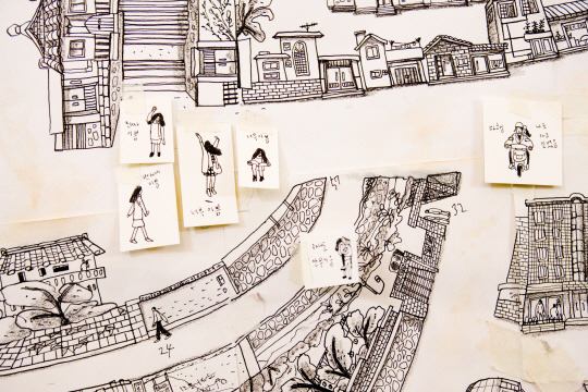 따분히 채널을 돌리다 보게 된 '슬로우 비디오'란 영화의 한 장면 중, 차태현이 자기가 살고 있는 동네를 끄적이 듯 그린 손그림이 나오는데, 오호라... 낙서 같지만 뭔가 그림체가 예사롭지 않아 혹시 알려진 '작가'가 그린 게 아닐까 하는 호기심이 생겼다. 급한 성격에 바로 검색을 해봤더니 역시나 '엄유정'이라는 작가님이 그리신 그림이었다.