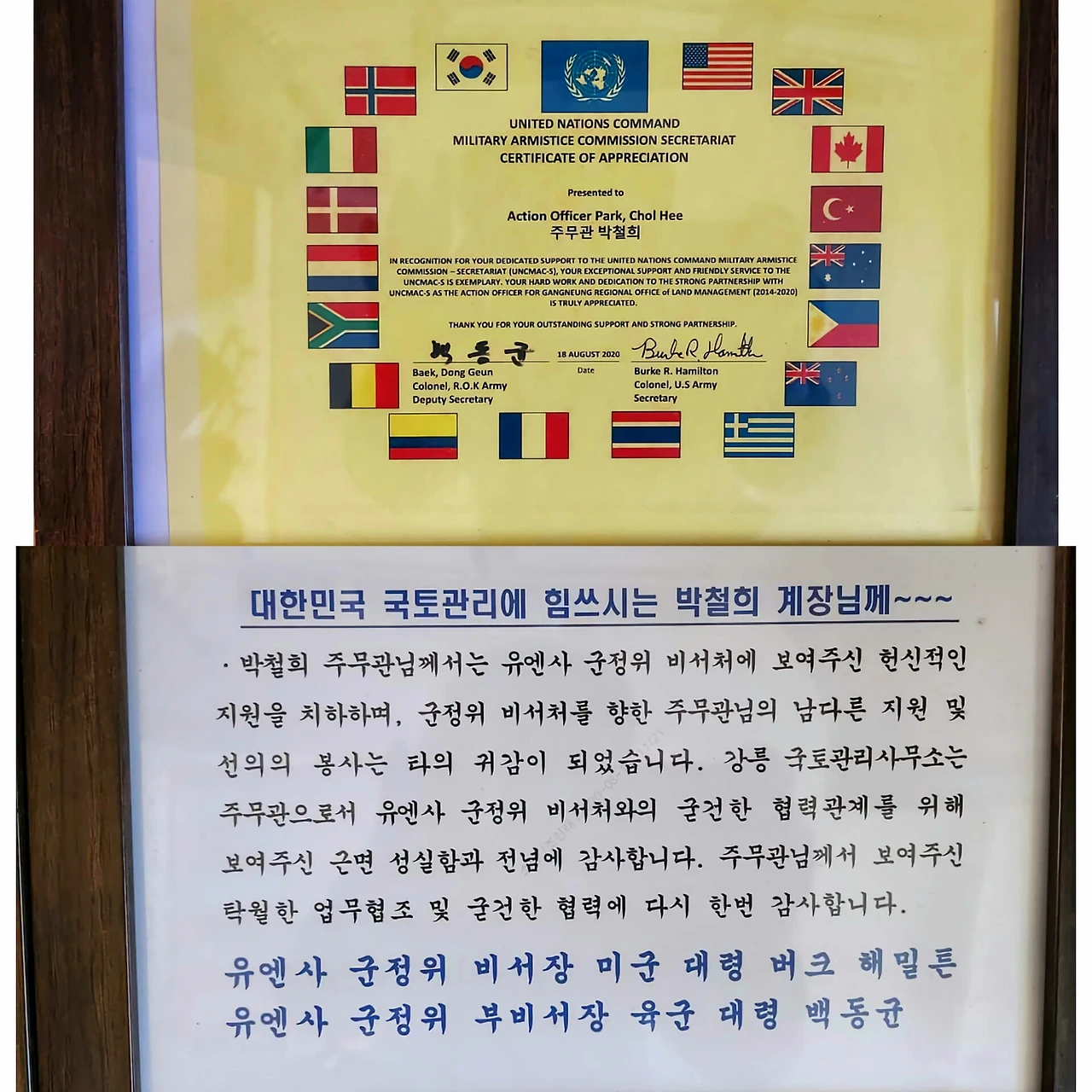 이러한 노력이 유엔사 비서장에게까지 보고가 된 것이었다. 그래서 아래와 같은 감사패를 전달받고 미군 비서관과 직접 영어로 통화도 했다. 정말 고맙다는 것 같았다^^ 내가 공무원이 끝날 때까지 다시는 받아보지 못할 평생 기억에 남을 큰 선물을 받았다.