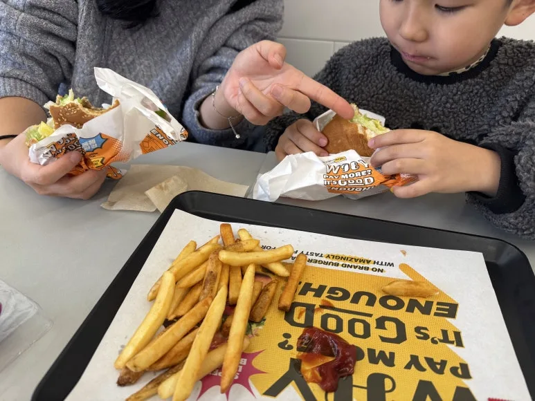"아빠, 여기서 햄버거 먹고 가자!"
