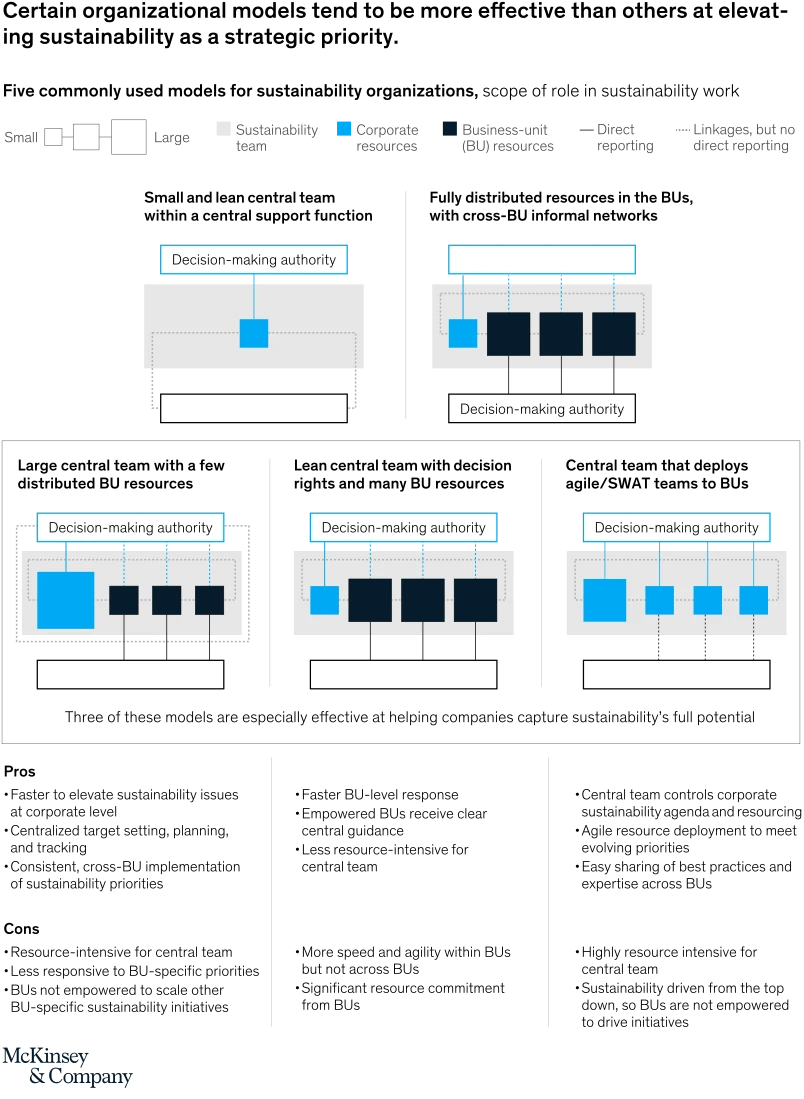 그러나 일부 조직 모델은 지속 가능성을 진정한 전략적 우선 순위로 높이는 데 다른 모델보다 더 효과적인 경향이 있습니다.
