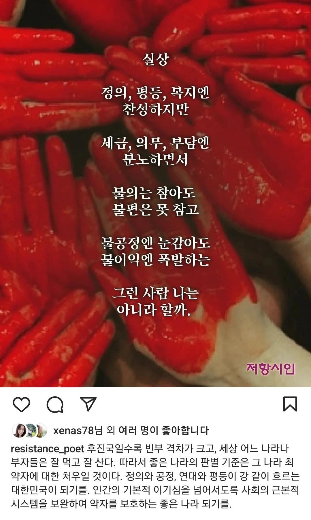 한 사회의 선진화 척도는 '국내 총생산이나 빠른 인터넷 속도'가 아니라 '약자에 대한 처우'라고 생각합니다. '장애인이, 비정규직이, 미혼모와 고아들이 어떤 삶을 살고 있나?', '국가와 사회가 그들과 얼마나 연대하고 있는가?' 이것이 좋은 사회의 척도입니다. 편리하고, 효율성 높은 우리나라에 정말 필요한 것은 '약자와 함께 하고, 내 것을 기꺼이 포기하여 약자의 자리를 만들어 주는 프랑스식 연대 정신(솔리다리떼)'인 것 같습니다. 지금 대한민국엔 각자도생의 무한경쟁 토너먼트 대신, 적극적으로 약자를 보호하는 사회 안전망, 실질적이고 강력한 약자 보호 시스템이 절실합니다. 버스나 지하철에서 뿐 아니라, 전망 좋은 핫플에서도 휠체어를 심심찮게 볼 수 있는 대한민국을 꿈꾸어 봅니다.