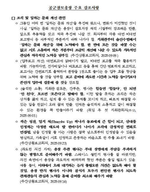 그동안 여러 번 일하는 문화 개선을 추진해 왔으나, 변화가 미진했던 것이 사실. ‘일하는 문화 개선’은 순전히 참모총장 의지만으로 쉽게 시급하게 달성할 수 있는 일은 아님. 앞으로도 구성원 한 사람 한 사람의 공감과 참여를 바탕으로 각자 위치와 역할에서부터 세부적인 부분까지 바뀌어 나가야 함. 지휘관부터 솔선수범해 일하는 방식과 문화를 혁신하고, 구성원이 체감할 수 있는 변화를 만들어내야 함. 상하 간의 수평적 소통과 열린 대화 분위기 속에서 신뢰가 쌓여 나갈 수 있도록 지속적인 관심과 적극적인 노력을 당부함.