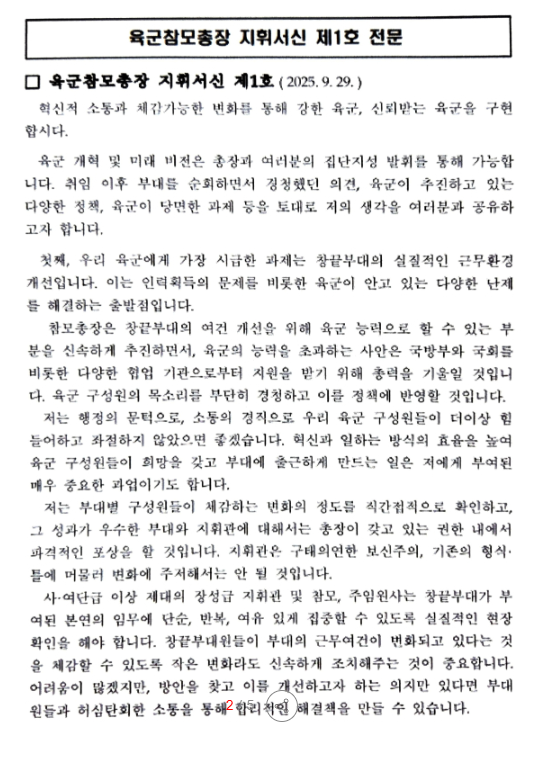 ■ 육군참모총장 지휘서신 제1호 (2025. 9. 29.)