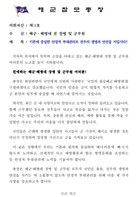 이 같은 상황에서 우리는 기본과 원칙에 충실하며 머리끝부터 발끝까지 안전보장을 생활화하고, 선제적인 사고 예방활동과 밝은 병영문화를 조성하는 노력을 아끼지 말아야 합니다.