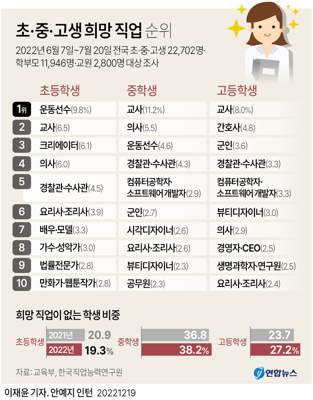 교원 2천여명 대상으로 희망직업 순위를 조사하였는데, 중학생은 군인이 6위 고등학생은 무려 3위였다.