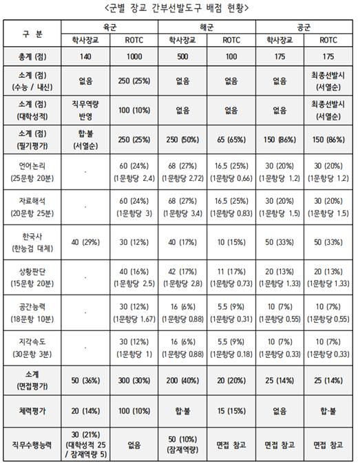 1. 군별 장교 간부선발도구 배점 현황입니다.