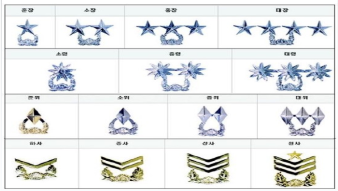 대한민국 계급체계는 1. 병사 2. 부사관 3. 장교 3단계로 분류된다.