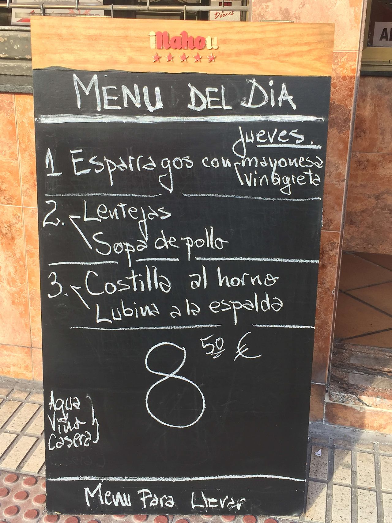 스페인 사람들은 점심에 진심이다. 점심은 하루 중 가장 중요한 식사다. 이 중요한 식사를 만족스럽게 하기 위한 현지인들의 팁이 하나 있다. 입간판이나 메뉴판에 '메뉴 델 디아'(Menu del dia)를 적어놓은 주인장의 글씨를 잘 살펴보는 것이다. 휘휘 날림 글씨로 급하게 써진 메뉴를 가진 식당일수록 제대로 된 '메뉴 델 디아'를 대접할 가능성이 높다고 한다. 미리 준비된 메뉴 없이 그날 아침 신선한 재료를 보고 바삐 새로 메뉴를 짜고 써내려 갔기 때문이다. 메뉴판의 글씨가 거칠수록 이 셰프가 얼마나 그날의 재료, 환경과 치열한 한 판 승부를 벌였는지를 드러낸다.