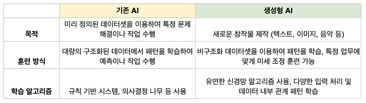 생성형 AI가 기존 AI와 다른 점을 크게 창조성, 범용성, 접근성 세 가지 차원에서 강조해보고자 한다. 먼저, 생성형 AI는 분석을 넘어 창조를 가능케 한다. 생성형 AI도 기술로 기존 AI와 완전히 다른 출발점을 지닌 상이한 AI는 아니다. 보다는 기존 AI에 해당되는 기술과 방법론, 개념 및 연구결과들을 활용한 하위분류로 이해될 수 있다. 다만, 전통적 ML 알고리즘이 주로 분류, 회귀, 클러스터링 같은 작업을 통해 패턴 인식, 예측 분석 등을 수행하고, 기존 데이터에서 패턴을 학습하여 이를 새로운 데이터에 적용하는 데 초점을 둔 반면, 생성형 AI는 데이터를 ‘생성’하는 데 초점을 둔다. 주어진 입력 데이터를 기반으로 새로운 데이터 인스턴스를 ‘창조’하는 것이다. 입력 데이터 속에 존재하는 패턴을 이해하는 것을 넘어 이를 바탕으로 존재하지 않았던 새로운 데이터를 생성할 수 있다.