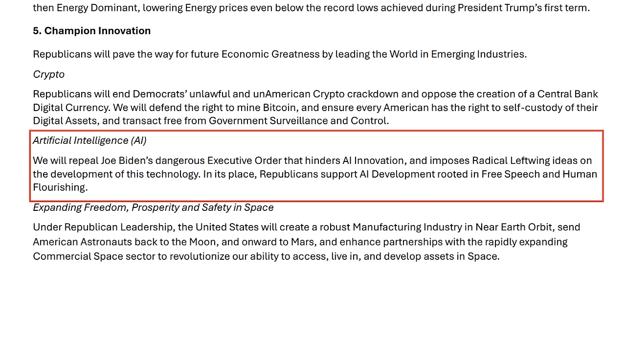 과거 2000년 선거에서 이긴 조지 부시 미국 대통령이 내건 정책은 명료했다. 'ABC', 'Anything But Clinton'의 머리글자다. 전임 빌 클린턴 대통령의 정책과 모두 반대로 하자는 것이다. 트럼프의 경우 ‘ABB’ (Anything But Biden)이 펼쳐질 것이라 전망하는 사람들이 많다. 실제로 트럼프는 대선에서 승리하면 취임 첫날 조 바이든 행정부의 AI 관련 행정명령뿐 아니라 인플레이션감축법(IRA) 등 친환경 정책을 백지화하겠다고 예고했다. 트럼프의 대선공약집인 “2024 GOP Platform Make America Great Again”에서는 아예 조 바이든의 ‘위험한' 행정명령을 폐기하겠다고 명시를 해두었다. 급진 좌파의 이념을 AI 기술 개발에 강요하고 AI 혁신을 저해한다는 것이다.