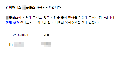 "X플러스 채용팀 OOO입니다. 메일 확인부탁드립니다."