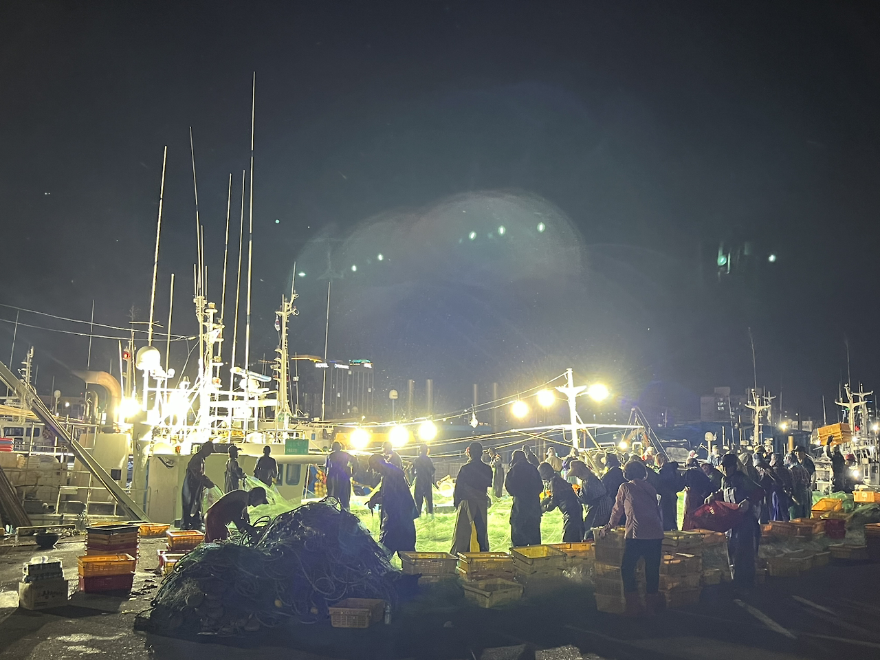 부두에 환하게 불을 밝히고 그물 주위로 수십명이 모여 능숙하게 조기를 터는 현장은 정말 놀라웠다.