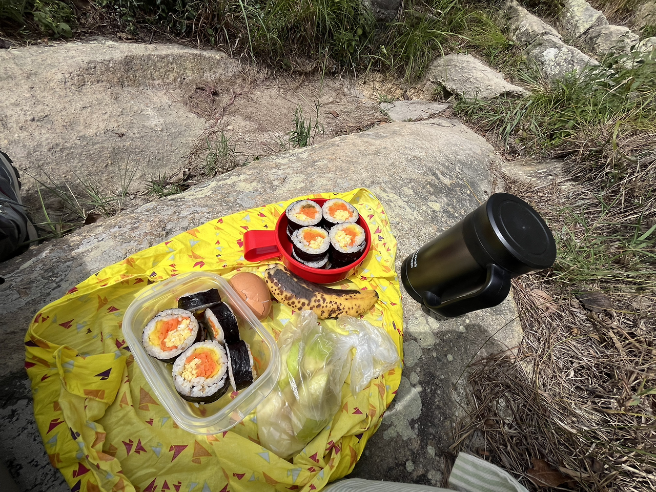 그래서 다시 운동을 열심히 해야 해서 산에 갔는데, 산에서 먹는 김밥이 또 맛있는 거다. 도르의 언니야가 싸준 당근김밥인데 별로 들어간 게 없는데도 맛있다. 맛있게 먹고 배불러서 또 운동하고.