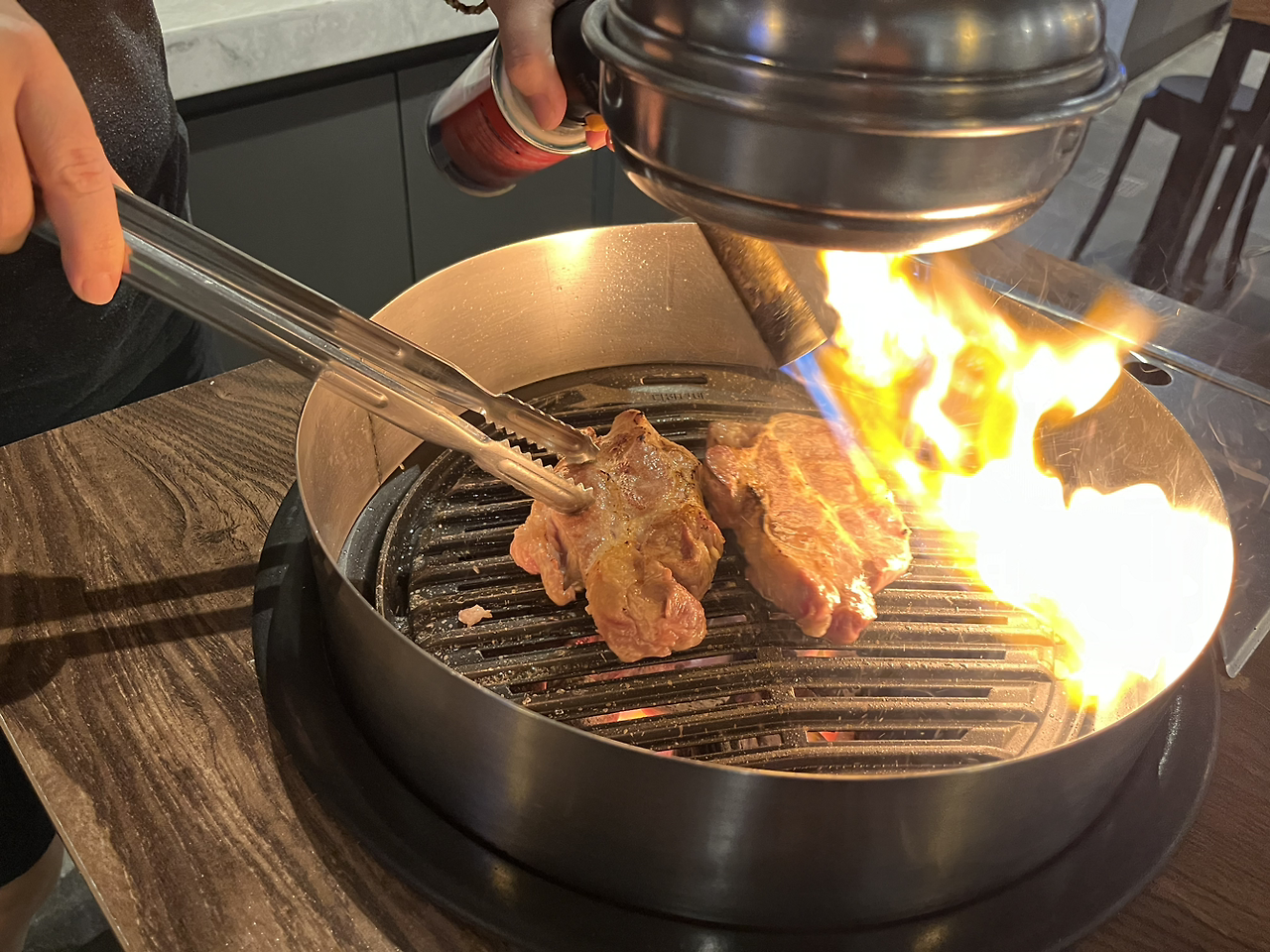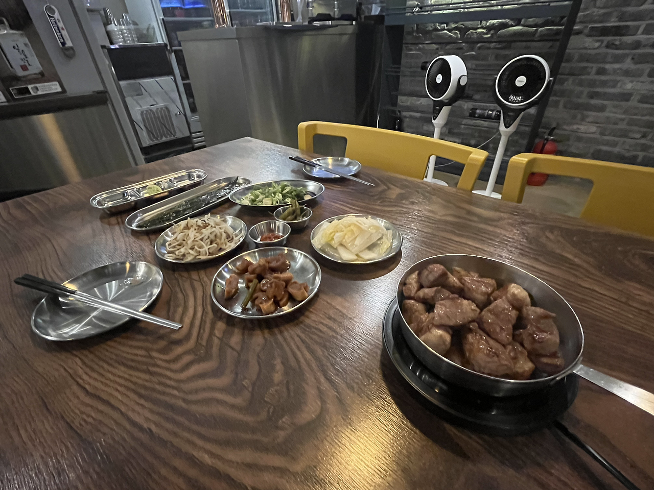 셰프님이 구워주는 고기를 기다리며 입안에 계속 침이 고였다. 첫 한 점은 소금에 찍어서, 두 번째 한 점은 와사비와 명이나물에 싸서 먹겠다는 계획까지 세우면서 군침을 꿀떡 삼키며 기다렸다.