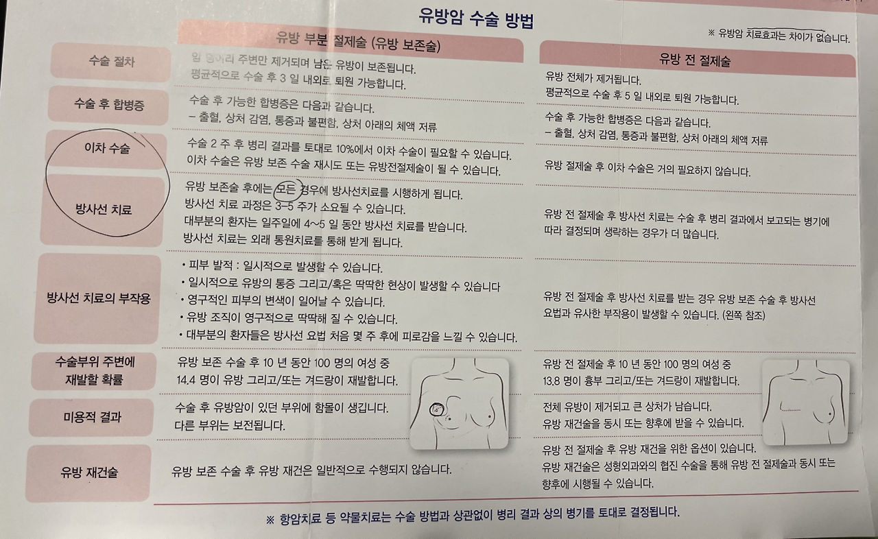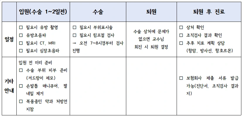 병원에서 안내한 유방암 수술 일정이다. 부분절제와 전절제, 유방암 기수에 따라 수술 일정은 차이가 있지만 보통 3~5일 정도의 입원 기간이 소요된다.