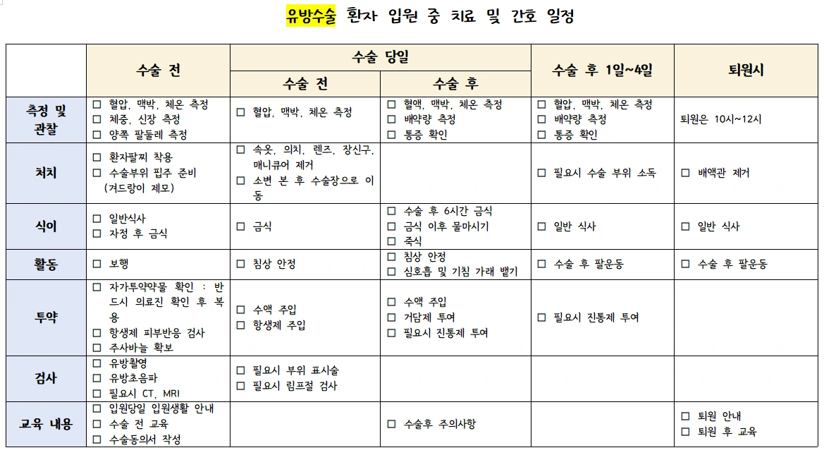 유방암 수술 입원 중 치료 일정은 위의 표를 참고하면 된다. 병원안내문인데 금식, 활동, 검사 등에 관한 자세한 안내가 나와 있다.