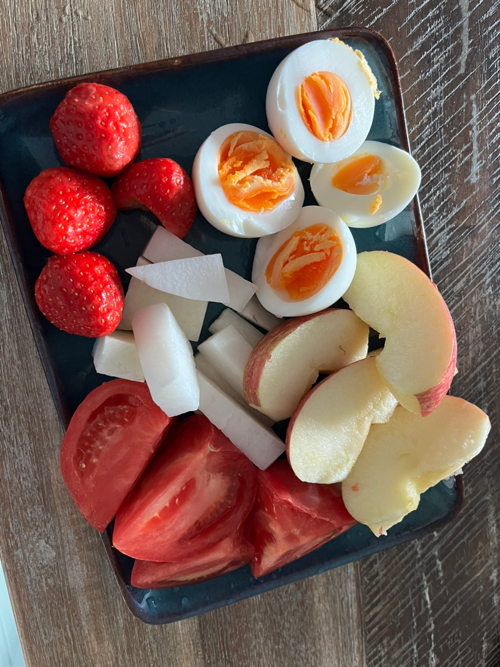 아침엔 그릭요거트, 샐러드, 사과 토마토를 번갈아가며 먹고, 아침 단백질 보충으로 계란 2개를 먹는다. 중년에는 근육이 빠져나가기 때문에 매끼 단백질을 잘 챙겨먹어야 한다고 한다. 그래서 매끼 단백질을 꼬박꼬박 챙겨먹는다. 아침에는 계란, 점심에는 두부나 고기 반찬, 저녁에는 두유를 먹는다.