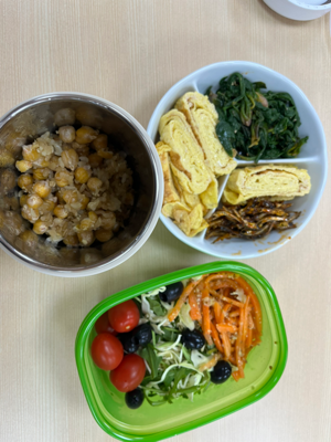 점심은 야채샐러드, 콩밥, 반찬 1~3가지 도시락을 먹는다. 도시락을 준비하는 것은 정말 귀찮은 일이다. 그래서 급식을 먹을까 생각해 봤는데, 나를 너무 잘 아는 동생의 조언을 듣고 포기했다.