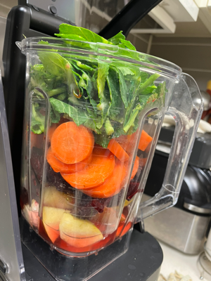 사과, 당근, 브로콜리, 양배추, 케일, 레몬, 비트를 갈아서 퓌레처럼 만들어 놓는다. 양배추와 브로콜리만 살짝 쪄서 진공블렌더로 간다. 1주일치를 만들어 놓고, 한 번에 두 숟가락 정도 떠서 물에 타서 먹는다. 양배추, 브로콜리를 먹는 게 좋다는데 챙겨 먹는 게 쉽지 않아서 매일 아침 주스로 먹고 있는 것이다.
