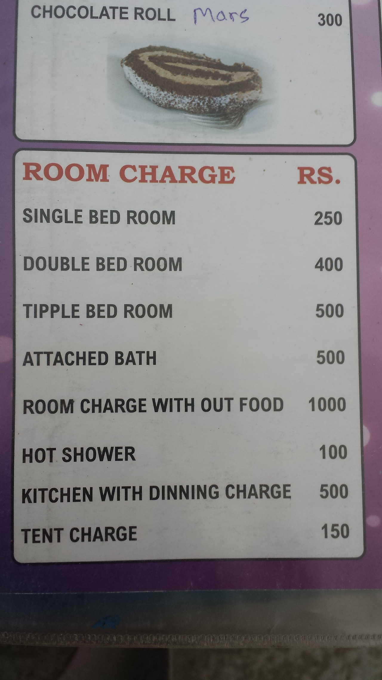 식사를 주문하러 메뉴판을 보다 웃음보가 터져 나왔다. 네팔 루피아의 환율을 보자면 100루피아가 한국돈으로 1,100원가량 됐다. 싱글룸 2,750원, 더블룸 4,400원, 트리플룸 5,500원, 음식 안 먹고 잠만 자면 11,000원, 뜨거운 물 샤워 1,100원, 앞마당에 텐트 치는 비용 1,700원가량. 물론 가격이 저렴해서 놀란 것도 있지만 음식 안 먹고 잠만 자면 싱글룸의 4배 가격을 지불해야 한다. 다시 말하자면 대부분의 로지는 숙박 비용보다 음식으로 수입을 올리고 있는 상황이니 꼭 밥을 먹으란 얘기다.
