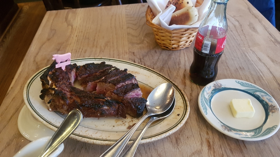 배고팠다. 하긴 전날 밤새고, 비행기 14시간 타고, 긴장하면서 숙소 오고. 더구나 기내식으로 먹은 비빔밥과 소고기는 노맛이었고. 멀리 가긴 싫었다. 숙소 주위에 뭐가 있을까 찾아봤다. 피터루거 스테이크 집이 있었다. 블로그를 믿지 않기 때문에 나름 검증받은 커뮤니티에서 정보를 찾아봤다. JMT란다. “음. 믿을만하군.” 가봤다. 원래 예약을 해야 갈 수 있는 곳이란다. 3시라는 애매한 시간에 가니 그냥 들어갔다. ㄱㅇㄷ! 스테이크 싱글을 시켰다. 날것을 좋아하므로 미디엄레어로. 56달러. 순간 당황했다. 이왕 뉴욕에 왔으니 먹어야겠다는 생각이 앞섰다. 콜라도 시켰다. 사진에서 볼 수 있다시피 양은 정말 많았다. 그리고 정말 맛있었다. 음미하면서 먹다 보니 어느덧 접시에는 두 조각밖에 남지 않았다. 충분히 배불렀다. 나가려고 했다. 그때 내 테이블을 담당하는 아저씨가 왔다. 그 아저씨는 계속 먹으라고 압박을 했다. 직접 소스를 부어주시면서. 뉴욕 첫날에 한국에서만 느낄 수 있는 정(情)을 느꼈다. 텍스와 팁을 포함해 74달러를 지불했다. 참고로 미국 현지의 맛을 담은 콜라도 한 잔 드링킹함.