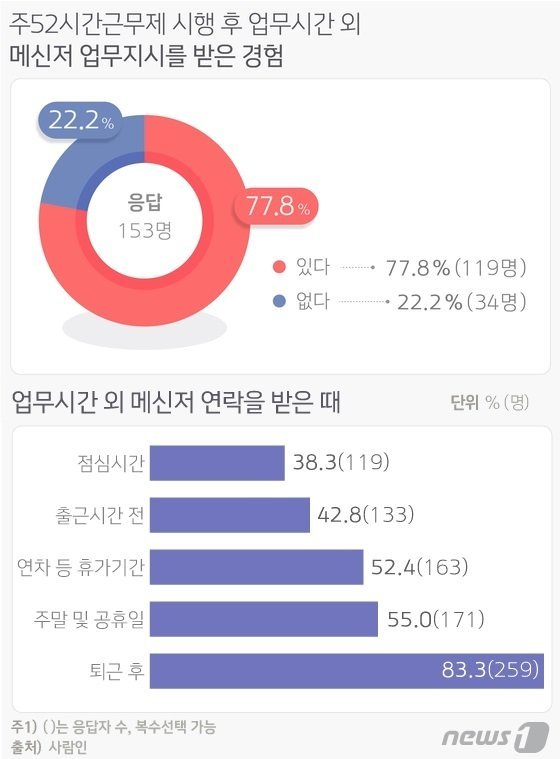 대부분의 직장인들은 카톡 알림이 반갑지만은 않을 것이다. '메신저 증후군'이라고도 하지만, 실상은 카톡 지옥에 가깝다. 업무 시간 외에 메신저로 업무 지시를 받은 경험을 조사한 결과 80%에 가까운 사람들이 '그렇다'고 응답했다. 메신저 점유율이 96%에 달하니 아마도 대부분은 카톡에 의한 업무 지시라고 봐도 무방하다.