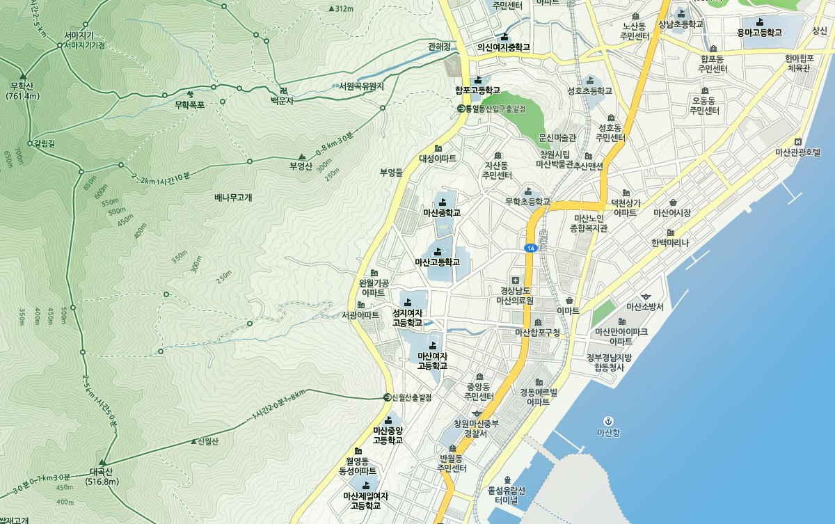 일대에서 학창 시절을 보내었다면 무학산을 한 번 씩 오른 경험이 있을 것입니다. 마산 한 가운데 자리 잡고 있는 무학산은 학이 날개를 펼치고 날아가는 듯한 모습을 하고 있다고 하여 그 이름이 붙여졌습니다. 진달래 군락이 화려하고 수목이 수려하기로 유명합니다. 해발 731.4m 높이로 정상에서 바라보는 풍경이 탁월합니다. 화창한 날이면 주택과 건물이 빼곡하게 들어선 마산과 창원 시내가 한 눈에 들어오고, 커다란 화물선이 마산만을 지나 남해를 가로지르며 뻗어 나가는 모습을 볼 수가 있습니다.