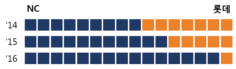놀랍게도 이듬 해부터 판도가 완전히 뒤집혔다. 두 번째 시즌이라는 사실이 믿어지지 않을 정도로 NC는 쭈욱쭈욱 치고 올라갔다. 128게임 중 70승을 기록, 전체 순위 3위에 안착하였다. 프로리그 2년 차인 2014시즌부터 3년 연속 포스트시즌에 진출한 것은 NC 선수들과 팬들의 프라이드다. 한편 가을 야구에서 롯데의 이름은 찾아 볼 수가 없었다. NC가 하늘을 바라볼수록 롯데는 점점 바닥으로 내려갔다.