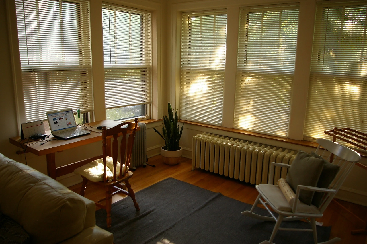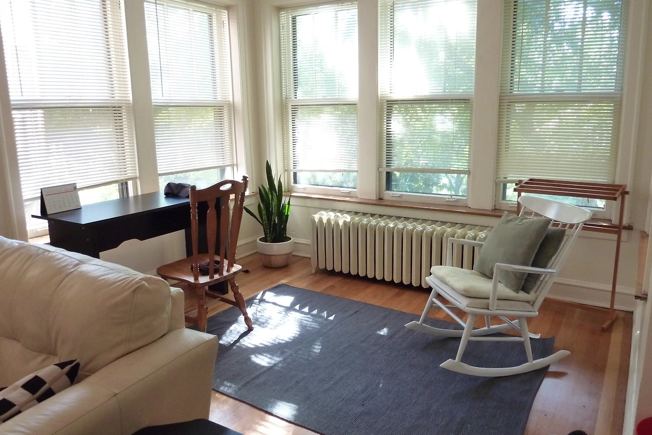 우리 집은 붉은 벽돌로 지어진 2층 오른쪽 집이었다. 안으로 들어서면 긴 복도가 있고 그 왼쪽으로 방이 하나, 오른쪽으로 안방과 화장실 있고, 그곳을 지나면 주방이 있고, 주방을 지나면 큰 거실이 나온다. 거실은 양방향이 길과 마주하고 있는 열린 구조인데 창문이 위로 열리는 옛날 그대로의 문이다. 이 창문이 신기하고 멋져서 자꾸만 열고 싶어졌다. 나중에 안 사실이지만, 이 옛날 구조의 창문은 방음이 잘 안 돼서 밖에서 들어오는 소음이 그대로 다 전달된다. 그런들 어떠하리, 어차피 주택가라 크게 시끄러울 일 없고 클래식해서 예쁘니 대만족이다. 거실 한쪽에는 약간 더 바깥으로 삐져 나간, 3면의 벽이 창으로 둘러 싸인 공간이 있었다. 미국에서는 이런 곳을 보통 선룸(sunroom)이라고 부르는데, 햇빛이 잘 들어오게 만든 곳으로 대부분의 집에 작게나마 이런 공간이 있다. 이곳에 인디애나에서 직접 색칠해서 가져온 흔들의자를 놓으니 우리가 생각했던 완벽한 공간이 되었다.