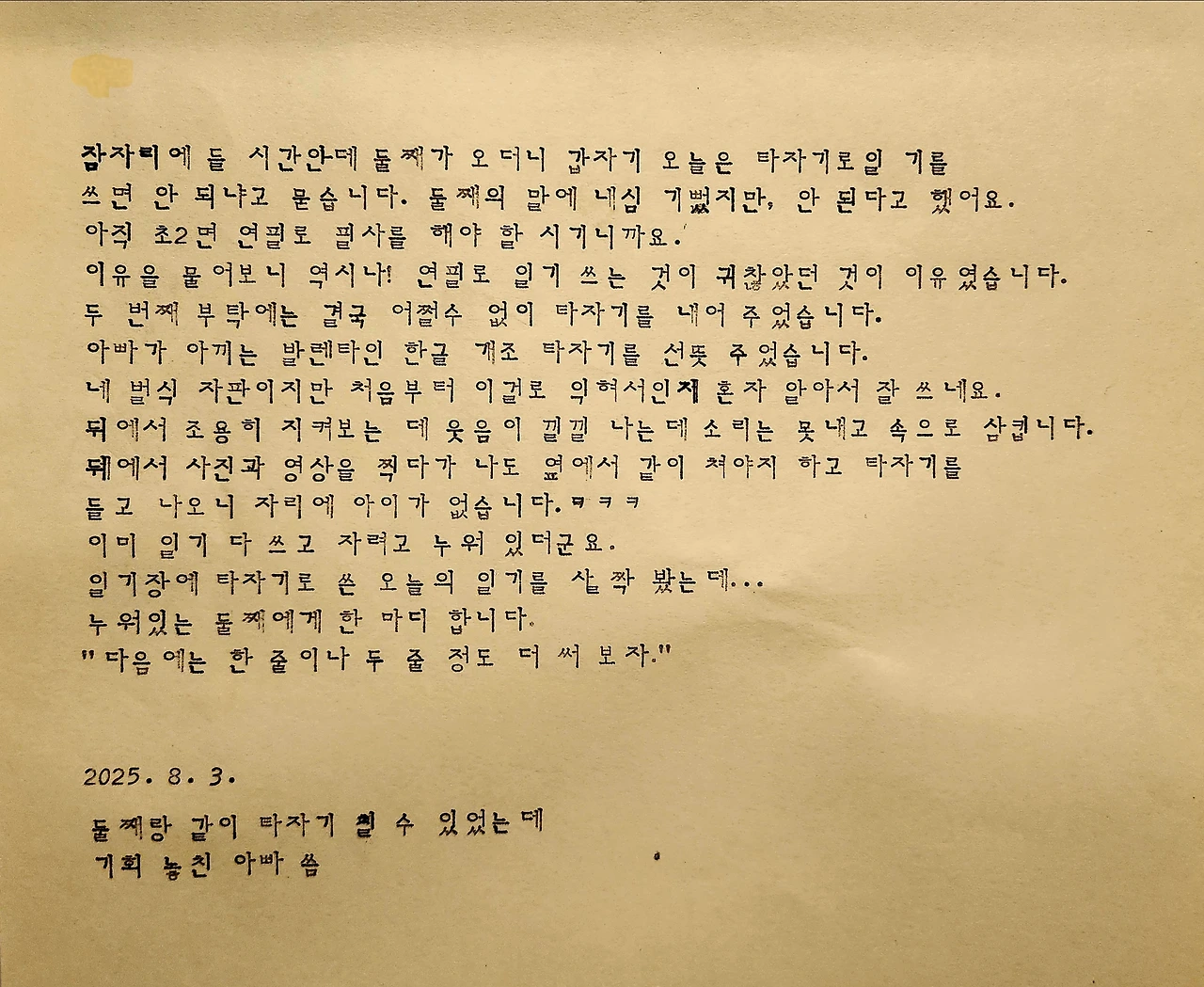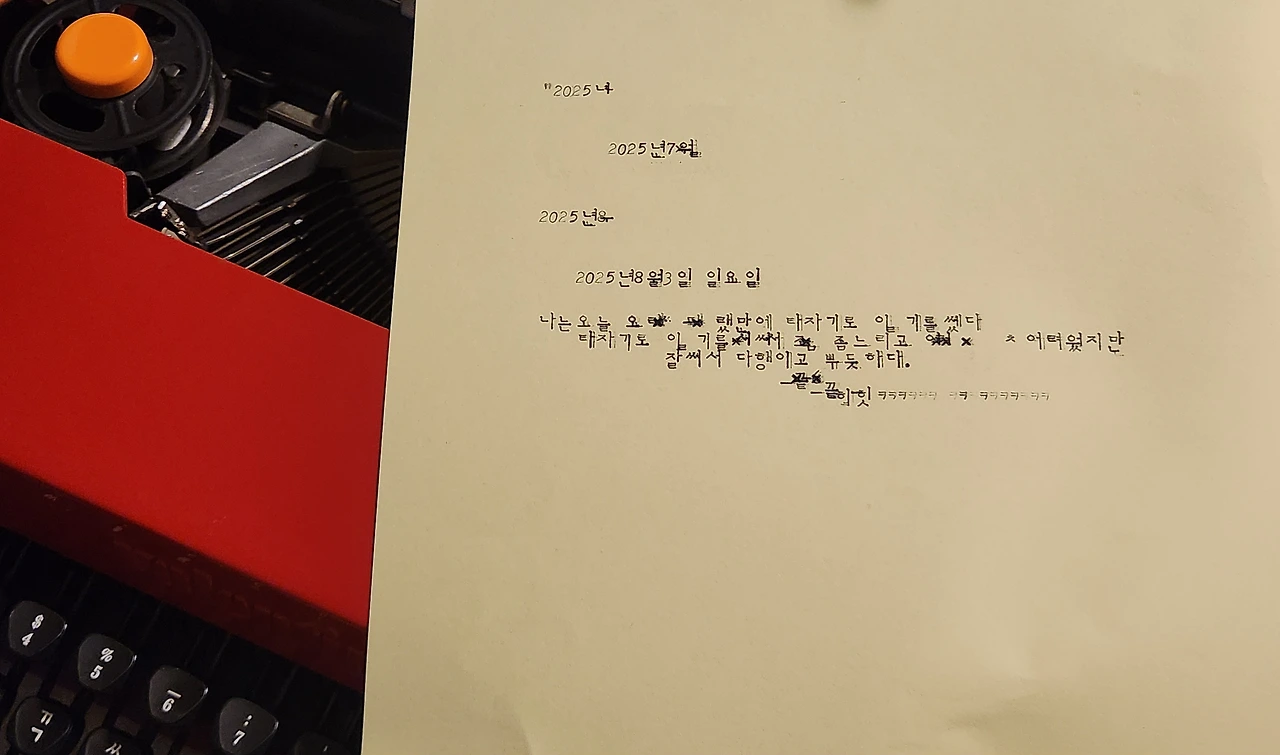 아마 제대로 쓴 일기라면 공개하기 어려웠을 텐데, 일기이지만 공개해도 크게 문제 될 것 같지는 않아서 공개합니다. 그래도 혼자 네 벌식 타자기를 다루는 뒷모습을 보면 신기하기도 하고 흐뭇하고 그러네요. 다음에는 조금 더 장문으로 써 주길 바라며,,,,