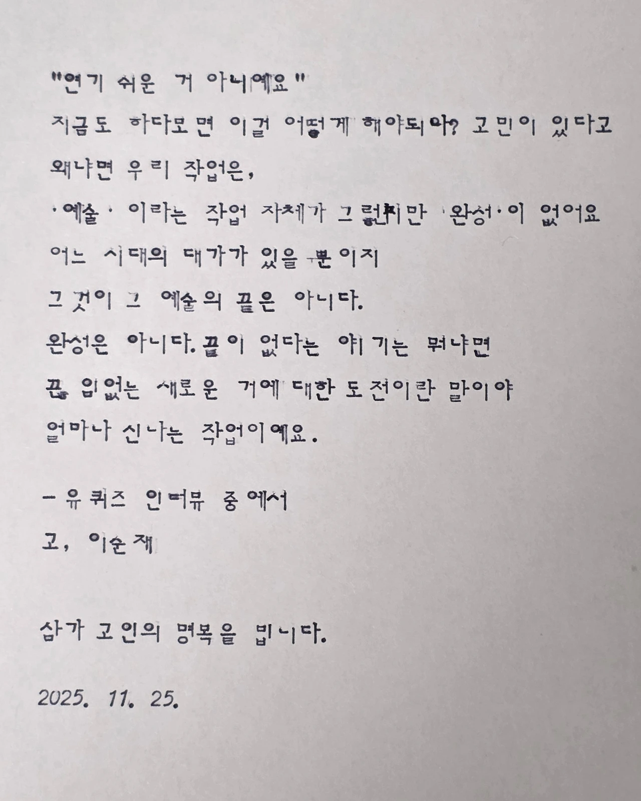고,이순재(1934-2025)선생님의 별세 소식에 생전에 인터뷰 중에 남기신 말씀 중에서 인상깊었던 말씀을 골라 타자기 필사를 통해 추모 합니다.삼가 고인의 명복을 빕니다.