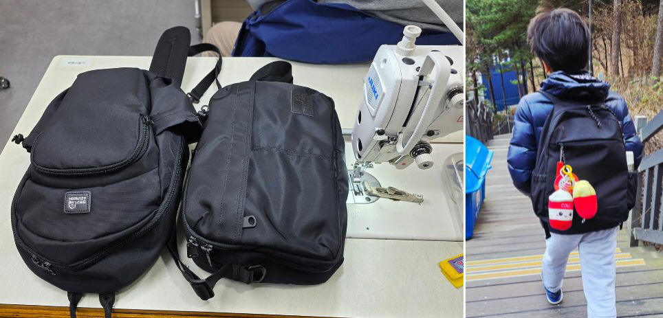 상반기에 했던 1기 아버지 봉제교실에서는 첫째 날 '에코백'으로 기본기를 다지고 나머지 3주 동안 '백팩'을 제작을 배웠다. 재봉틀을 처음 배워서 내 손으로 직접 만들었다는 성취감 때문인지 에코백은 항상 애용하는 나의 최애 가방이 되었고, 백팩은 초등학생인 큰 아들이 마침 1학년 때부터 사용하던 가방을 교체해 줄 시기와 타이밍이 기가 막히게 맞아떨어지면서 아주 잘 사용되고 있다. 가방의 크기도 지금 체구에 딱 맞았다. 등교하는 아이의 등에 있는 가방을 보면 아직도 뿌듯함 끓어오른다.