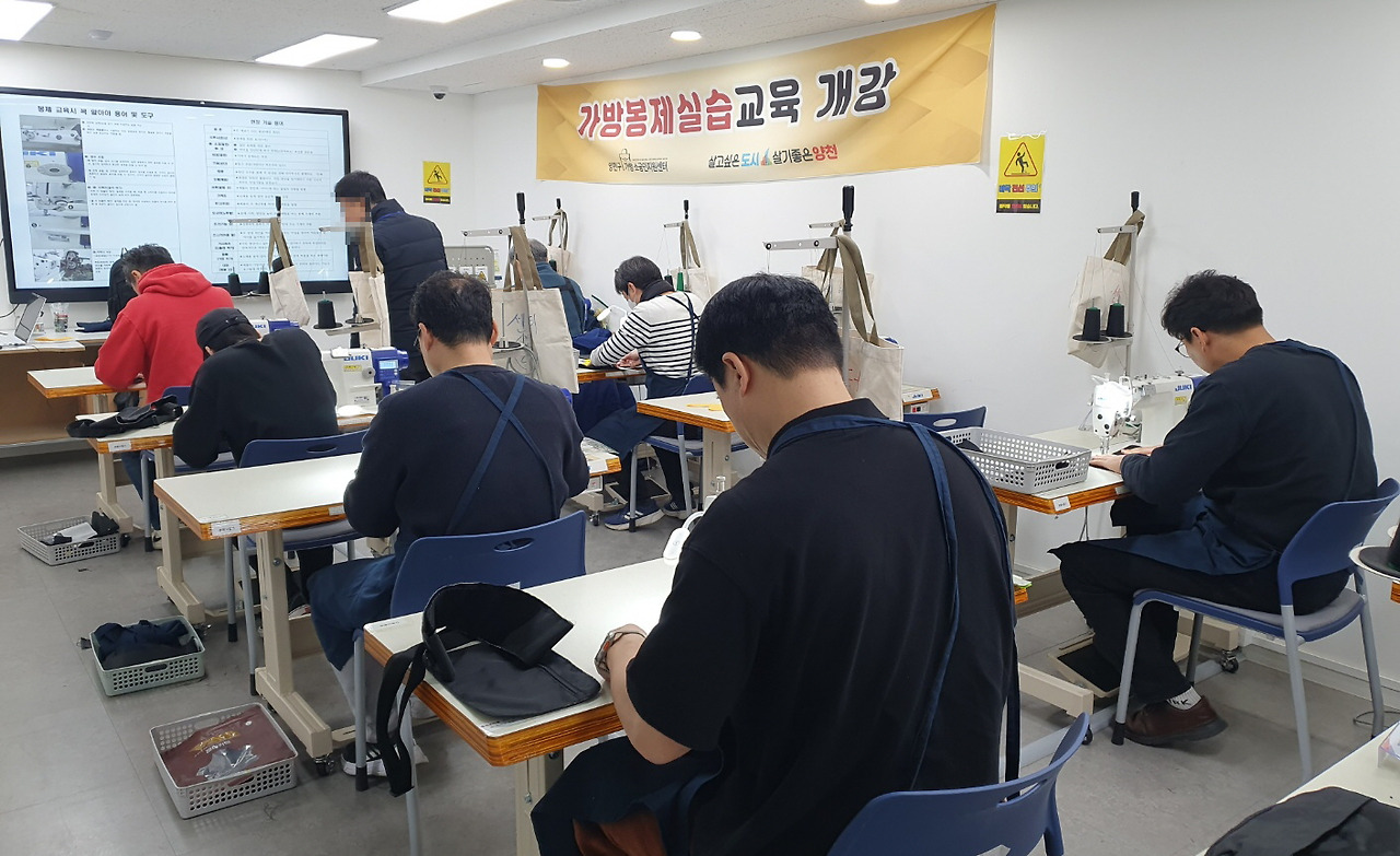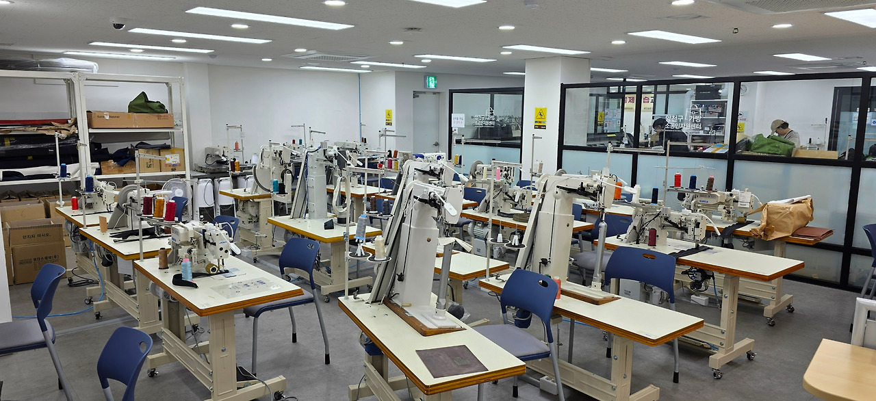 여기는 서울시 양천구 신월동. 신월동이지만 강서구 화곡동 같은 느낌의 위치이다. 버스정류장에서 내려 도보로 약 5분 거리에 "양천구가방소공인지원센터"가 있다. 센터는 이 건물의 3층과 지하 1층을 사용하고 있다. 필자가 참여하는 '아버지봉제교실'은 지하 1층 교육장에서 진행된다. 지하 계단으로 내려가 문을 열고 들어가면, 재봉틀의 규모에 동공이 확장되며 시선을 압도당하게 된다.