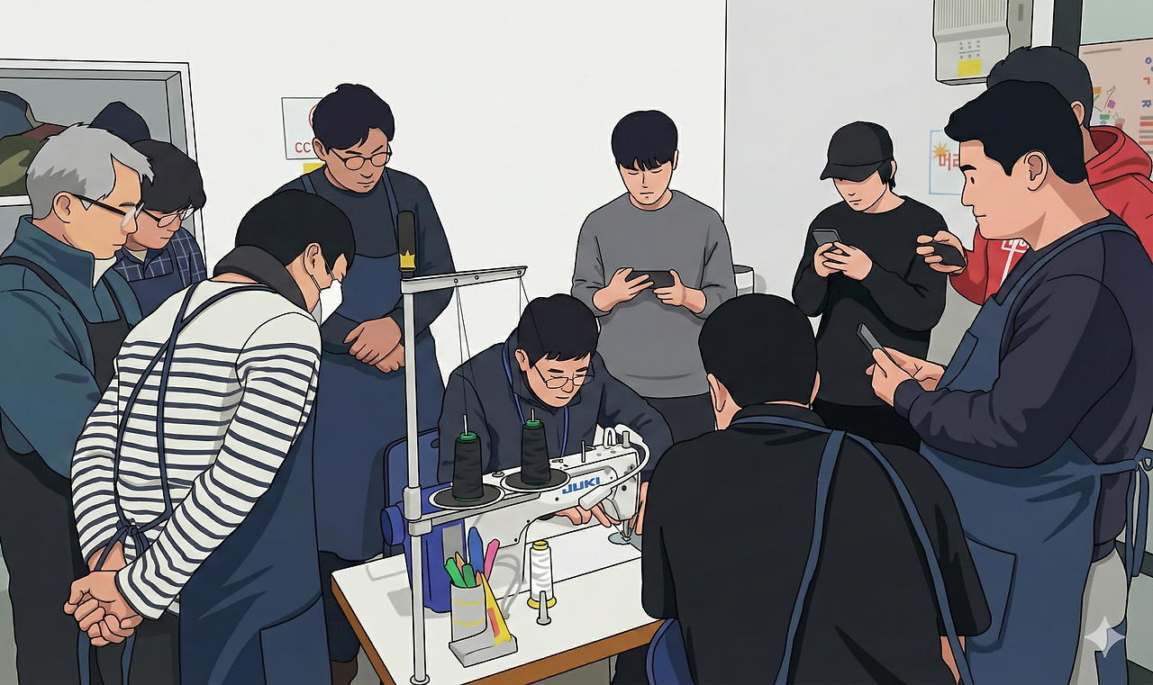 강사님이 제작 과정 설명을 위해 모이라고 하면 각자 자리에서 일어나 강사님의 재봉틀로 모여 강사님을 둘러싸고 서서 강사님의 설명과 손놀림을 관찰한다. 머리로는 설명을 듣으며 과정을 머릿속으로 그려보고, 눈으로는 박음질이 되는 과정을 살핀다. 매니저님이 시범 과정을 촬영해 단톡방에 올려주지만 소용없다. 분명 눈으로 보고 머리로 이해했다 생각했는데, 막상 내 자리에 앉으면 머릿속이 하얗게 변한다. 이놈의 기억력. 50대 아빠의 비애다.