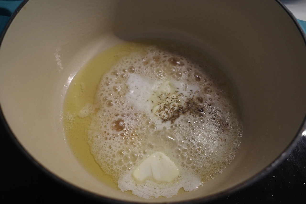 올리브유를 두른 냄비에 버터 한 숟갈을 넣고 타임(향신료) 가루를 톡톡 넣는다. 그리고 베이컨을 넣어 달달 볶는다.