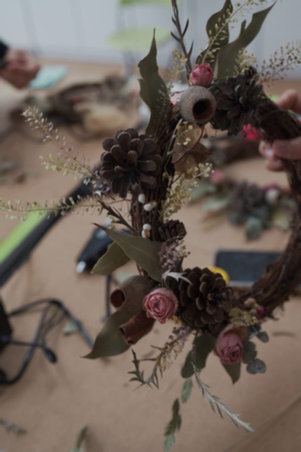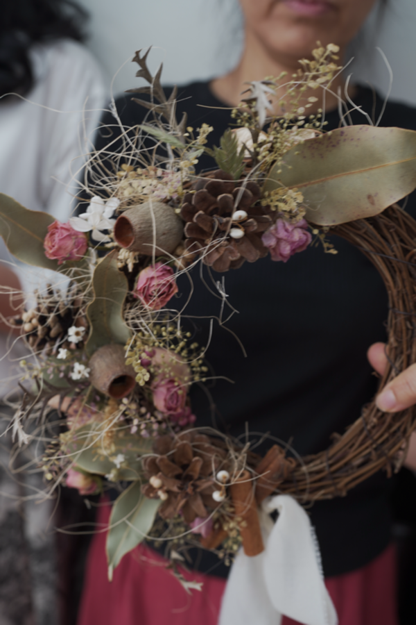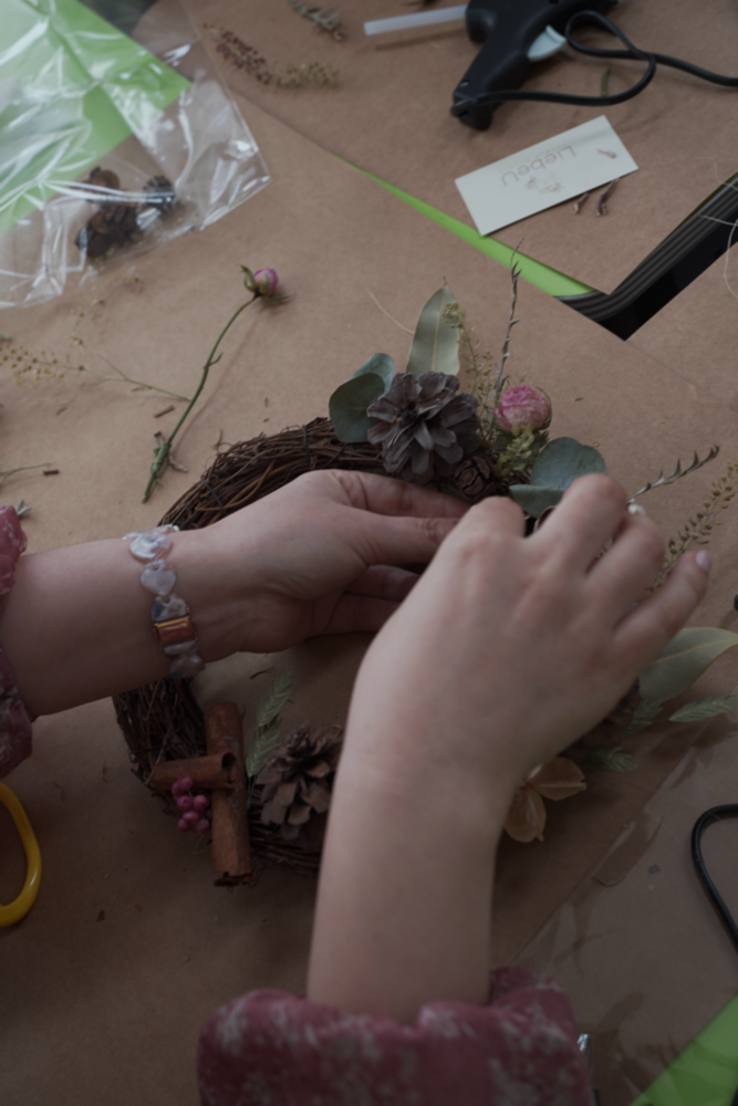 참여자 분들 모두 손재주가 좋아서 수업 작품이 더 완성도가 높았다. 그 중 몇분은 "저는 처음이에요"라고 하셨지만 모두 예쁘게 잘 만들어주셨다. 생각보다 재미있다고도 말씀해주셨다. 가들 소재들이 지닌 특유의 자연스러움이 주는 편안함 덕분인지, 다들 부담 없이 자유롭게 작품을 완성해 나가는 모습이 정말 보기 좋았다. 한편으로는 내가 처음 꽃을 다룰 때의 그 설렘이 떠오르기도 해서, 그 마음을 함께 나누는 것 같아 더 뿌듯했다.