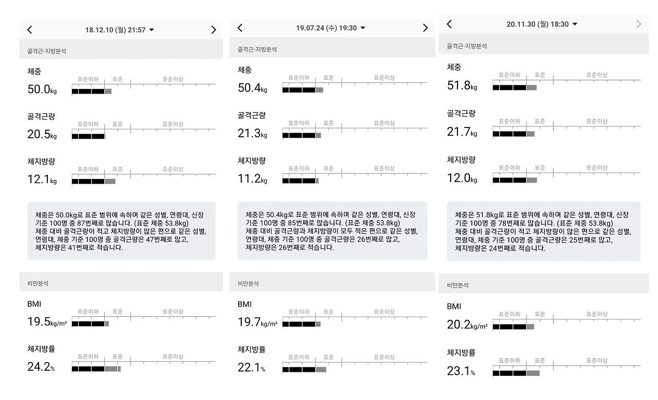 요지부동이던 근육량에 변화가 생겼다. 클라이밍을 시작하기 전인 2018년 12월 나의 근육량은 20.5kg. 2019년 5월부터 클라이밍을 시작했고, 같은 해 7월 말 근육량은 0.8kg 늘어난 21.3kg을 기록했다. 누군가는 겨우 0.8kg 늘어난 걸 갖고 변화라 할 수 있냐며 반문할 수도 있지만 이건 나에게는 매우 큰 수치다. 과거에 6개월 동안 PT 50회 받고 늘어난 근육량이 고작 0.2kg였으니까 0.8kg 증가면 어마어마한 변화라 볼 수 있지 않을까?
