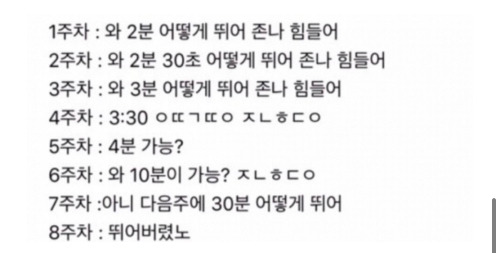 한 주 한 주 지날수록 달리는 시간이 길어졌다. 적응할라치면 달리기 시간이 늘어나버리니까 매주 힘들었다. "할 수 있습니다! 정~말 할 수 있습니다"라는 런데이 코치의 응원이 없었다면 진작에 때려치웠을지도 모른다.