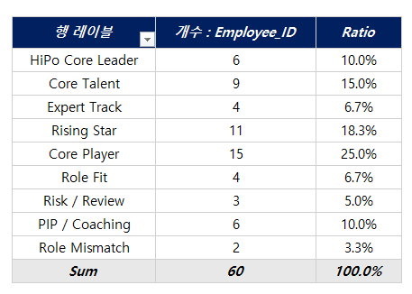 Excel의 [Pivot Table]을 통해 각 박스에 포함된 인원 수를 정리하면 다음과 같습니다.