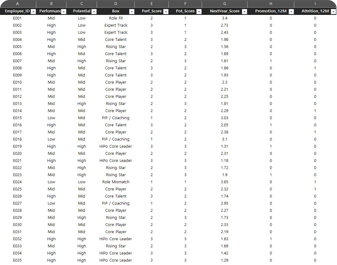 E열: Perf_Score (전년도 성과평가: High=3, Mid=2, Low=1)