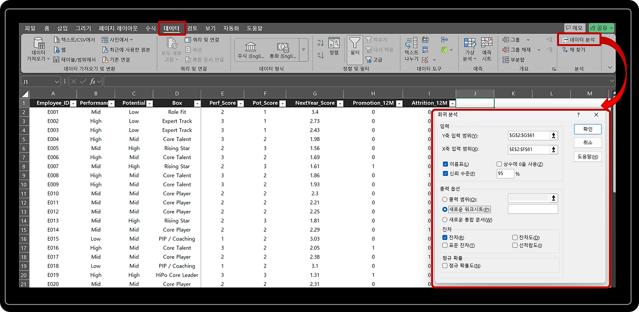 우선, 종속변수와 독립변수를 다시 확인합니다. 종속변수(Y)는 NextYear_Score, 독립변수(X)는 Perf_Score 와 Pot_Score입니다. 그리고 데이터의 개수는 60개입니다. 데이터 샘플을 보면, E1은 [Perf_Score], F1은 [Pot_Score], G1은 [NextYear_Score] 입니다. 즉, E열, F열, G열의 1행에는 변수의 이름이 입력되어 있습니다. 이렇게 각 변수의 1행에 이름이 입력되어 있어야 Excel의 데이터 분석에서 Lables(레이블) 옵션을 사용할 수 있습니다.