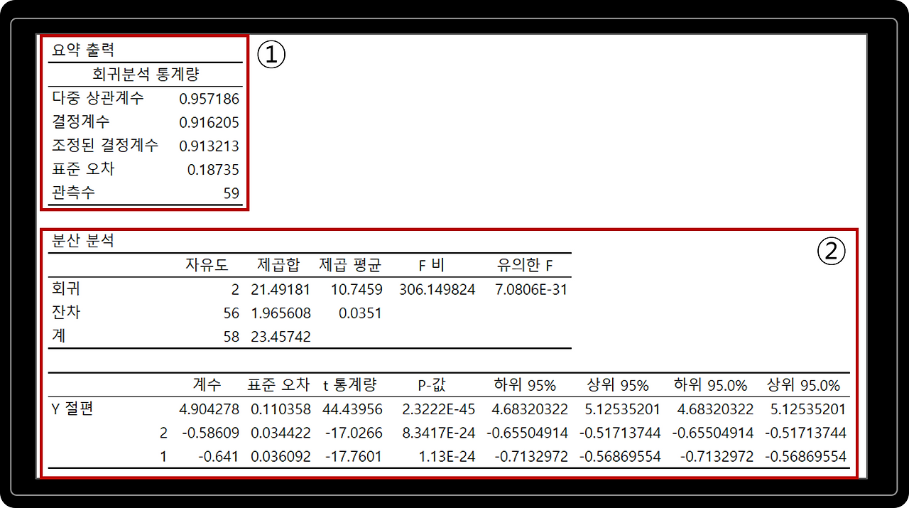 ③ 조정된 결정계수 (Adjusted R square)=0.913213입니다. 조정된 결정계수는 독립변수의 개수를 고려하여 약간의 패널티를 가한 R²라고 할 수 있습니다. 달리 말해 '과적합(Overfitting)'된 부분을 보정한 값이라는 의미를 갖습니다. 그래서 결정계수는 0.916이었는데, 조정된 결정계수는 0.913으로 조금 낮아졌습니다. 이는 변수를 두 개 넣었다고 하여 조정된 결정계수가 부풀려진 것이 아니라, 정말 의미 있게 설명력이 높은 상태에 있는 것으로 볼 수 있습니다.
