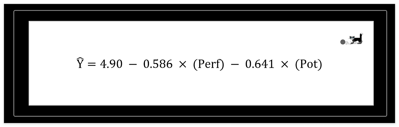 ② 변수 "2"는 Perf_Score, 변수 "1"은 Pot_Score를 뜻합니다. 위 회귀분석의 결과를 바탕으로 두 개의 독립변수와 종속변수 간의 관계를 수식으로 나타내면 아래와 같습니다.