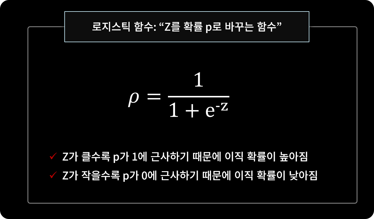 마지막으로 z를 확률 p로 바꾸는 함수가 바로 로지스틱 함수입니다. 로지스틱 함수에서 확률 p는 다음과 같이 계산합니다.
