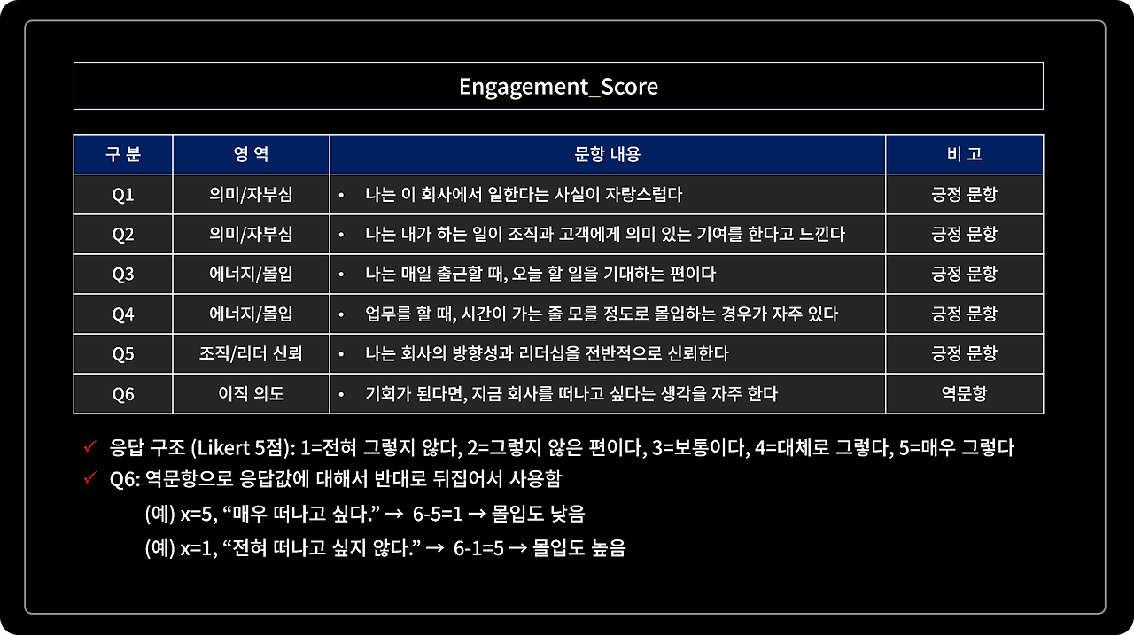 대표적인 예로 직원1을 보겠습니다. Engagement가 4점입니다. 세부 문항에서 Q1=4, Q2=4, Q3=4, Q4=3, Q5=4, Q6=2로 응답했습니다. 따라서 Q6은 역문항이기 때문에 실제 점수 변환 시에는 6-2=4점입니다. 따라서 직원1의 Engagement Score=(4+4+4+3+4+2)/6=23/6≒3.83입니다. 반올림하면 4.0이 됩니다.