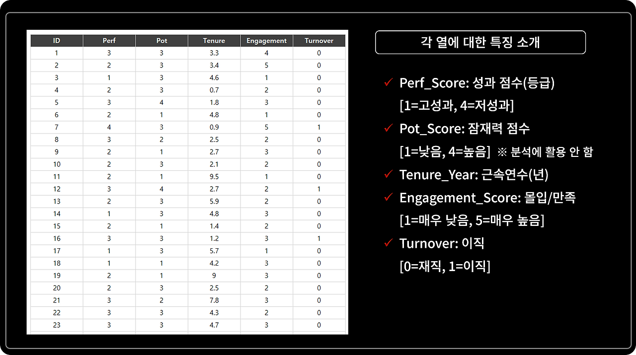 이직 예측 분석을 위해 아래와 같은 데이터 샘플을 활용하겠습니다. 각 열은 직원의 고유 식별값인 ID를 시작으로 오른쪽으로 Perf (성과 점수/등급), Pot (잠재력 점수), Tenure (근속연수), Engagement (몰입도), Turnover (이직/재직 여부)로 구성됩니다. 현실에서는 기업의 연간 이직률이 5~20% 사이에서 형성되는 것이 보통인데, 이러한 점을 반영하여 Turnover=1은 60명 중 6명 (약 10%) 정도로 설정되어 있습니다.
