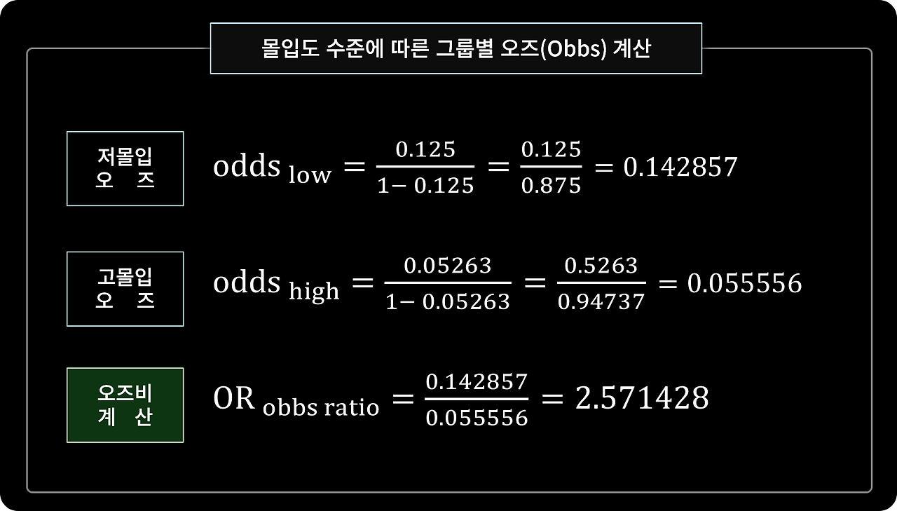 저몰입 그룹의 오즈는 0.14, 고몰입 그룹의 오즈는 0.05 수준입니다. 마지막으로 오즈비(OR, Obbs ratio)를 계산하면 2.57이 나옵니다. 결론적으로 저몰입 그룹은 고몰입 그룹에 비해 이직에 대한 오즈가 2.57배 정도 높다는 뜻입니다. 바꿔 말하면, "저몰입 그룹은 고몰입 그룹보다 이직 쪽으로 기울어진 정도가 2.57배 수준이다."라고 말할 수 있겠습니다.